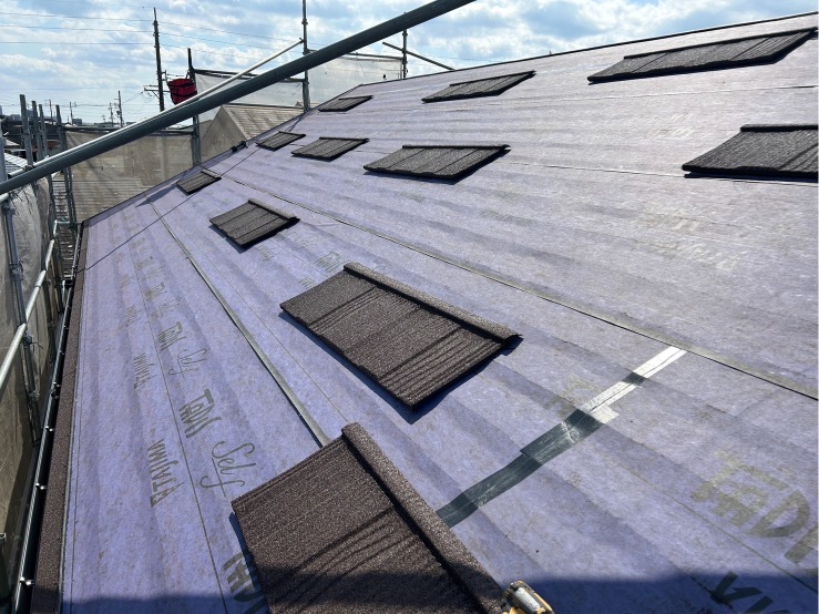 今回は、高い耐久性と意匠性を誇るLIXILのTルーフを採用。新しい屋根材を施工する前には、最新の**防水シート(ルーフィング)**も新たに敷き直すため、雨漏りの心配を格段に軽減することができました。