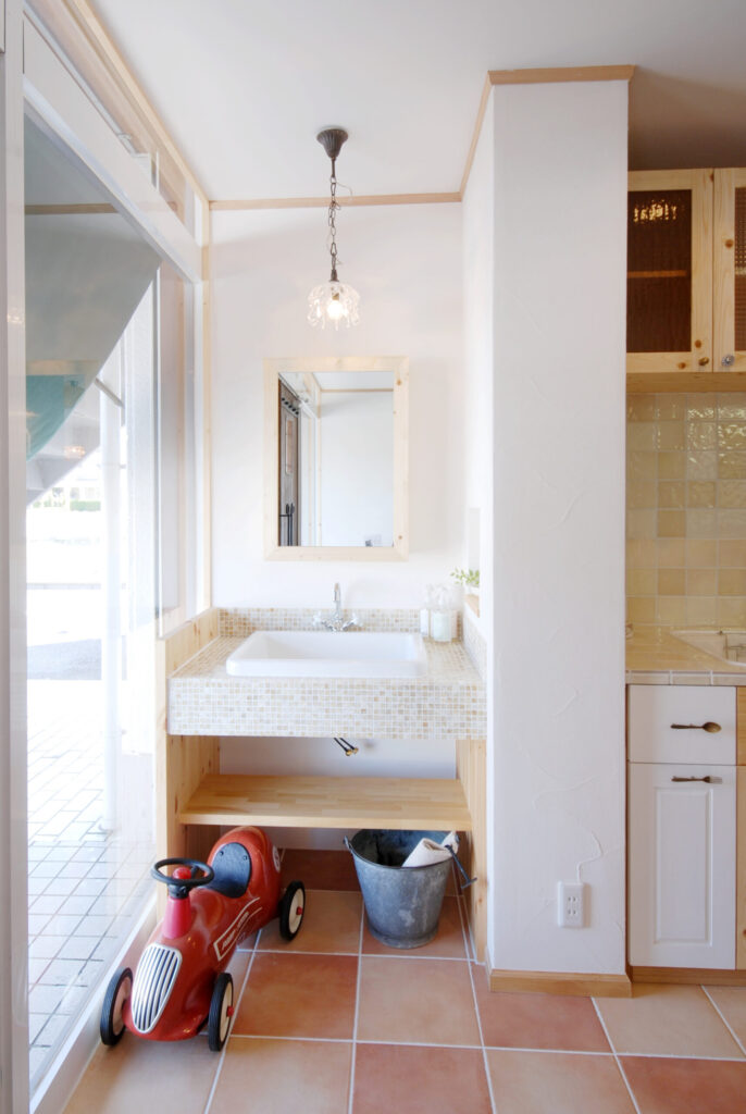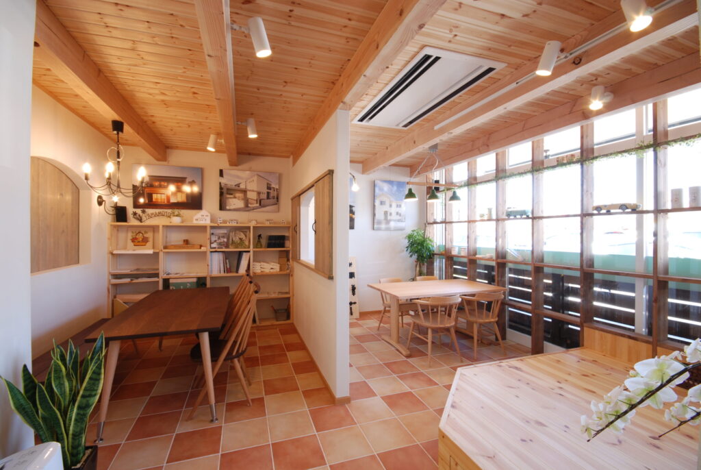 岐阜市にある『岐阜正木店』は天井の梁や塗り壁など、自然素材のぬくもり溢れる店舗。造作洗面化粧台やオーダーキッチンなど、ナチュラルなライフスタイルが体感できます。