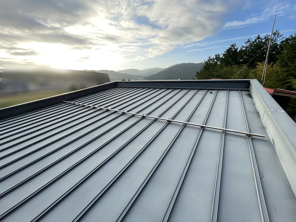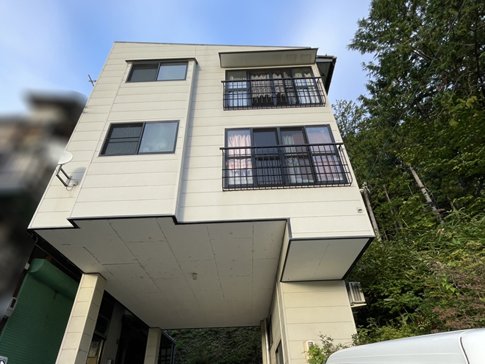 現地調査では実際に屋根へ上がり、劣化状況や傷み具合を細かくチェック。調査内容は写真を用いてご説明し、現状をしっかり共有しました。建物は3階建てのため足場設置が不可欠であることから、将来的なメンテナンスコストの軽減を見据えて外壁塗装との同時施工をご提案。山沿いという立地特性上、湿気の影響を受けやすく藻やカビが発生しやすい環境だったため、外壁には防カビ・防藻性能に優れた「アレスダイナミックTOP」を採用しました。屋根には耐候性と美観の持続性を兼ね備えた「スーパークリスタル ルーフペイント」を使用し、外装全体の耐久性向上を図っています。