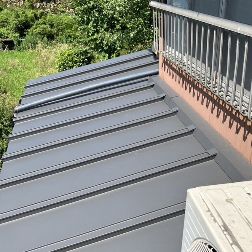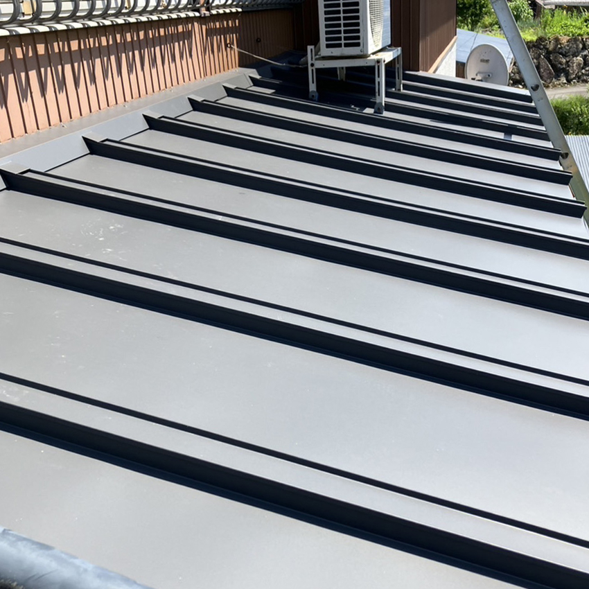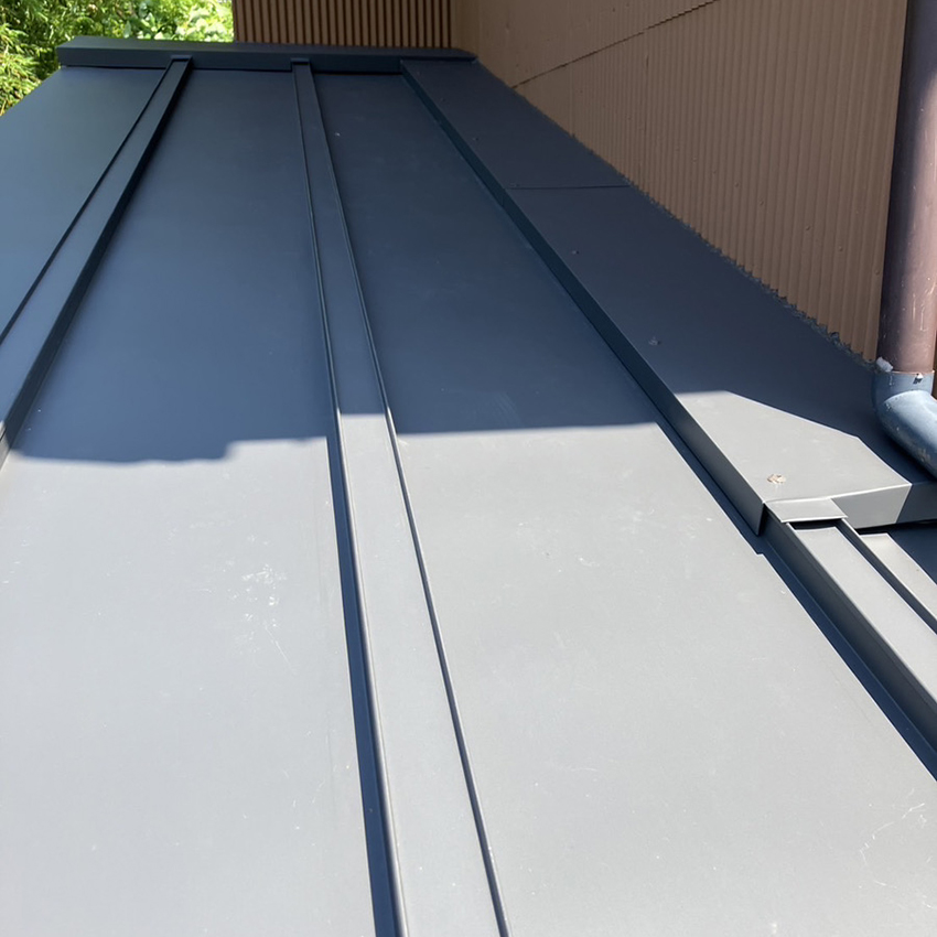 まずは営業スタッフと職人さん(板金)で現状を確認しました。屋根には傷がつき、塗装が剥げた部分から錆が生じていました。玄関上の既存屋根は状態も良かったので、S工法(カバー工法)で上から新たなカバーを葺き上げる工法で施工。他の下屋はS&W工法(ハゼ葺き)で葺き替えの提案をいたしました。