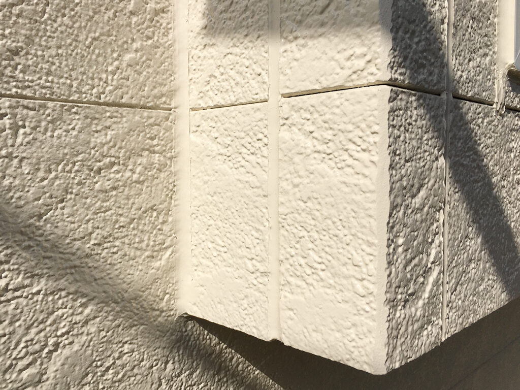 コーキングは劣化しボロボロになっていましたので、丁寧にはがして新しいものに打ち直しています。外壁塗装に使用したスーパームキコートは無機成分によって塗膜をつくりますので、静電気を帯びにくく親水性(水がツルツルすべる)があります。ですので汚れが付きにくく、汚れが付いた場合も雨で自然と洗い流され、耐久年数分美しさが続きます。